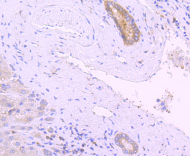 Immunohistochemical analysis of paraffin-embedded human liver tissue using anti-PKC delta antibody. The section was pre-treated using heat mediated antigen retrieval with Tris-EDTA buffer (pH 8.0-8.4) for 20 minutes.The tissues were blocked in 5% BSA for 30 minutes at room temperature, washed with ddH2O and PBS, and then probed with the primary antibody (HA750325, 1/50) for 30 minutes at room temperature. The detection was performed using an HRP conjugated compact polymer system. DAB was used as the chromogen. Tissues were counterstained with hematoxylin and mounted with DPX.