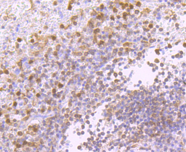 Immunohistochemical analysis of paraffin-embedded human spleen tissue using anti-PKC delta antibody. The section was pre-treated using heat mediated antigen retrieval with Tris-EDTA buffer (pH 8.0-8.4) for 20 minutes.The tissues were blocked in 5% BSA for 30 minutes at room temperature, washed with ddH2O and PBS, and then probed with the primary antibody (HA750325, 1/50) for 30 minutes at room temperature. The detection was performed using an HRP conjugated compact polymer system. DAB was used as the chromogen. Tissues were counterstained with hematoxylin and mounted with DPX.