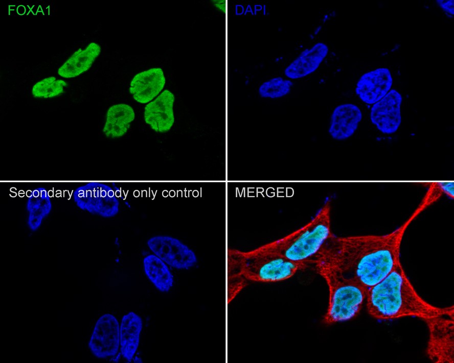 Cells were fixed in 4% paraformaldehyde for 20 minutes at room temperature, permeabilized with 0.1% Triton X-100 in PBS for 5 minutes at room temperature, then blocked with 1% BSA in 10% negative goat serum for 1 hour at room temperature. Cells were then incubated with Rabbit anti-FOXA1 antibody (HA750363) at 1/250 dilution in 1% BSA in PBST overnight at 4 ℃. Goat Anti-Rabbit IgG H&L (iFluor™ 488, HA1121) was used as the secondary antibody at 1/1,000 dilution. PBS instead of the primary antibody was used as the secondary antibody only control. Nuclear DNA was labelled in blue with DAPI.
