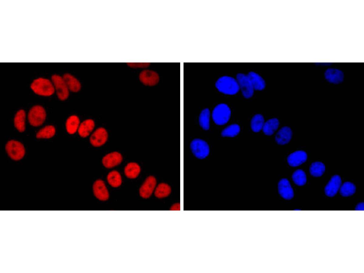 ICC staining of FOXA1 in MCF-7 cells (red). Formalin fixed cells were permeabilized with 0.1% Triton X-100 in TBS for 10 minutes at room temperature and blocked with 10% negative goat serum for 15 minutes at room temperature. Cells were probed with the primary antibody (HA750363, 1/50) for 1 hour at room temperature, washed with PBS. Alexa Fluor®594 conjugate-Goat anti-Rabbit IgG was used as the secondary antibody at 1/1,000 dilution. The nuclear counter stain is DAPI (blue).