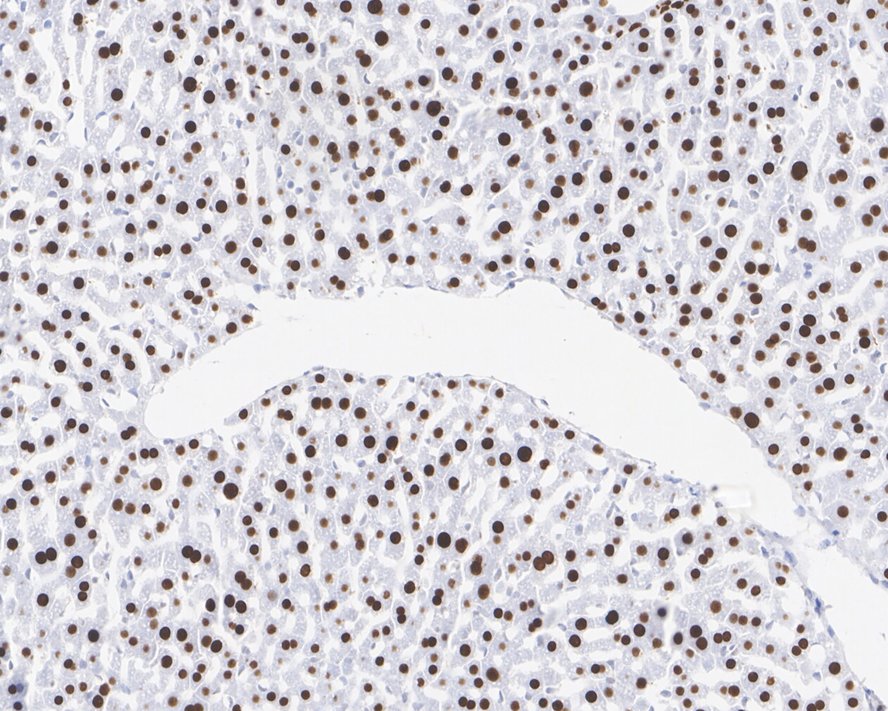 Immunohistochemical analysis of paraffin-embedded mouse liver tissue with Rabbit anti-FOXA1 antibody (HA750363) at 1/500 dilution.