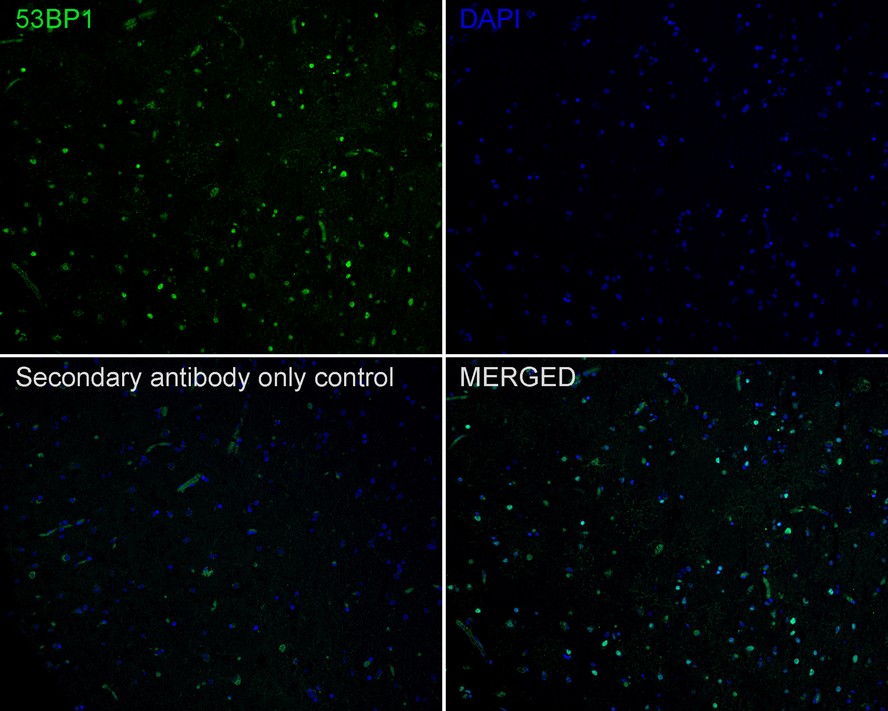 Immunofluorescence analysis of paraffin-embedded human brain tissue labeling 53BP1 with Rabbit anti-53BP1 antibody (HA750400) at 1/200 dilution.