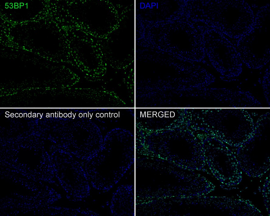 Immunofluorescence analysis of paraffin-embedded mouse testis tissue labeling 53BP1 with Rabbit anti-53BP1 antibody (HA750400) at 1/200 dilution.