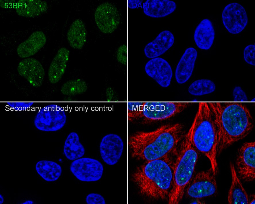 Cells were fixed in 100% precooled methanol for 5 minutes at room temperature, then blocked with 1% BSA in 10% negative goat serum for 1 hour at room temperature. Cells were then incubated with Rabbit anti-53BP1 antibody (HA750400) at 1/50 dilution in 1% BSA in PBST overnight at 4 ℃. Goat Anti-Rabbit IgG H&L (iFluor™ 488, HA1121) was used as the secondary antibody at 1/1,000 dilution. PBS instead of the primary antibody was used as the secondary antibody only control. Nuclear DNA was labelled in blue with DAPI.