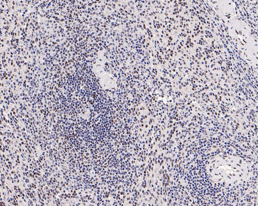Immunohistochemical analysis of paraffin-embedded human spleen tissue with Rabbit anti-53BP1 antibody (HA750400) at 1/200 dilution.