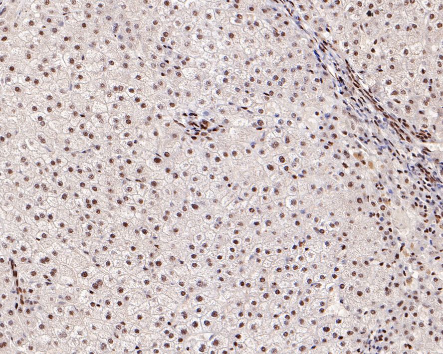 Immunohistochemical analysis of paraffin-embedded human liver tissue with Rabbit anti-53BP1 antibody (HA750400) at 1/200 dilution.