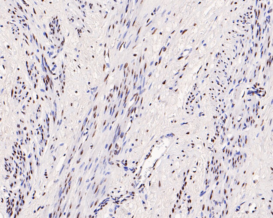 The section was pre-treated using heat mediated antigen retrieval with Tris-EDTA buffer (pH 9.0) for 20 minutes. The tissues were blocked in 1% BSA for 20 minutes at room temperature, washed with ddH2O and PBS, and then probed with the primary antibody (HA750400) at 1/200 dilution for 1 hour at room temperature. The detection was performed using an HRP conjugated compact polymer system. DAB was used as the chromogen. Tissues were counterstained with hematoxylin and mounted with DPX.
