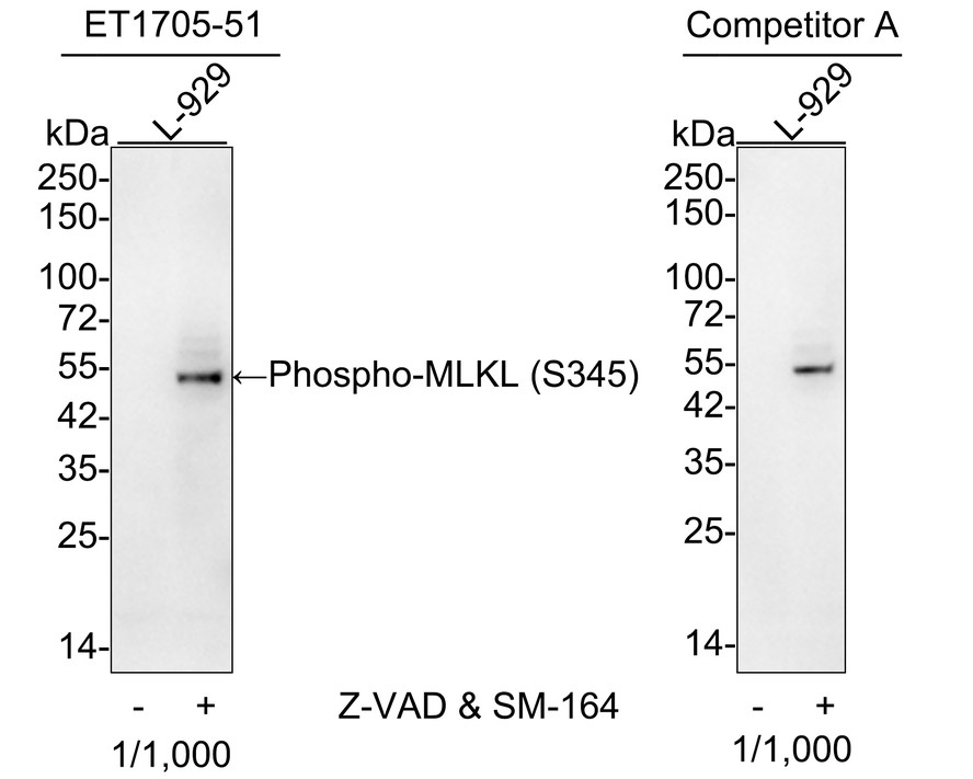 Western blot analysis of Phospho-MLKL (S345) on different lysates with Rabbit anti-Phospho-MLKL (S345) antibody (HA750433) at 1/1,000 dilution and competitor's antibody at 1/1,000 dilution.