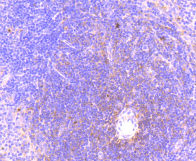 Immunohistochemical analysis of paraffin-embedded mouse spleen tissue using anti-Phospho-MLKL (S345) antibody. The section was pre-treated using heat mediated antigen retrieval with Tris-EDTA buffer (pH 9.0) for 20 minutes.The tissues were blocked in 5% BSA for 30 minutes at room temperature, washed with ddH2O and PBS, and then probed with the primary antibody (HA750433, 1/50) for 30 minutes at room temperature. The detection was performed using an HRP conjugated compact polymer system. DAB was used as the chromogen. Tissues were counterstained with hematoxylin and mounted with DPX.