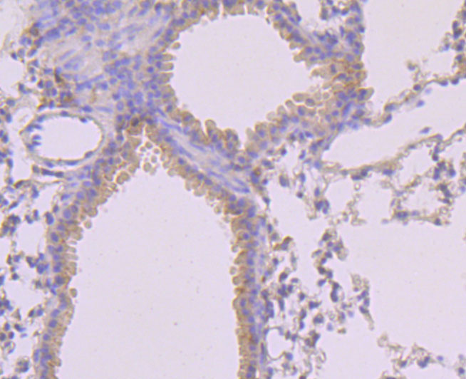 Immunohistochemical analysis of paraffin-embedded mouse lung tissue using anti-Phospho-MLKL (S345) antibody. The section was pre-treated using heat mediated antigen retrieval with Tris-EDTA buffer (pH 9.0) for 20 minutes.The tissues were blocked in 5% BSA for 30 minutes at room temperature, washed with ddH2O and PBS, and then probed with the primary antibody (HA750433, 1/50) for 30 minutes at room temperature. The detection was performed using an HRP conjugated compact polymer system. DAB was used as the chromogen. Tissues were counterstained with hematoxylin and mounted with DPX.