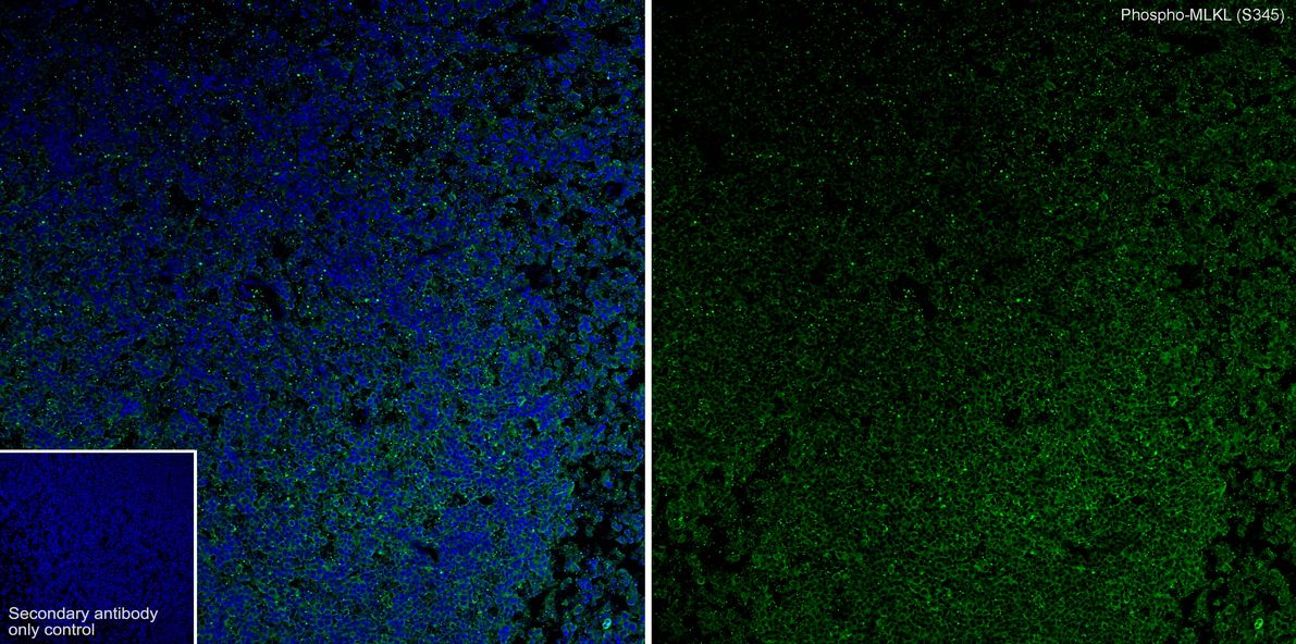 Immunofluorescence analysis of frozen mouse spleen tissue with Rabbit anti-Phospho-MLKL (S345) antibody (HA750433) at 1/100 dilution.