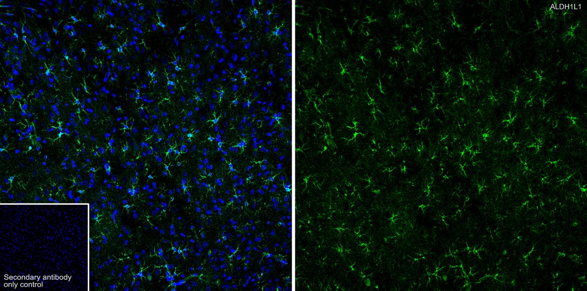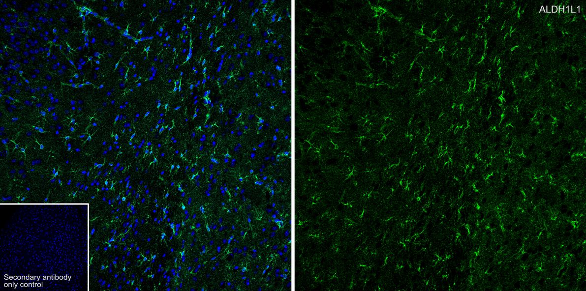 Immunohistochemical analysis of paraffin-embedded mouse brain tissue with Rabbit anti-ALDH1L1 antibody (HA750457) at 1/1,000 dilution.