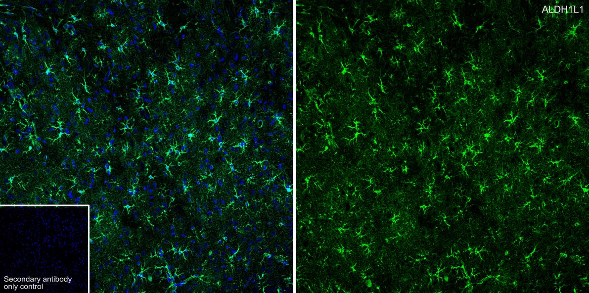 Immunohistochemical analysis of paraffin-embedded rat hippocampus tissue with Rabbit anti-ALDH1L1 antibody (HA750457) at 1/1,000 dilution.