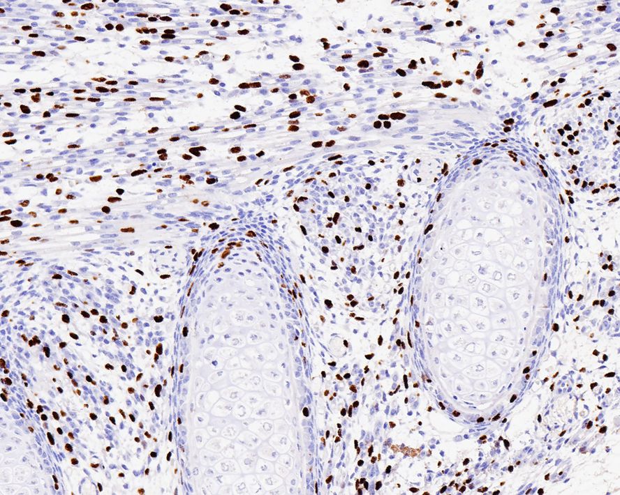 The section was pre-treated using heat mediated antigen retrieval with sodium citrate buffer (pH 6.0) (high pressure) for 2 minutes. The tissues were blocked in 1% BSA for 20 minutes at room temperature, washed with ddH2O and PBS, and then probed with the primary antibody (HA750590) at 1/10,000 dilution for 1 hour at room temperature. The detection was performed using an HRP conjugated compact polymer system. DAB was used as the chromogen. Tissues were counterstained with hematoxylin and mounted with DPX.