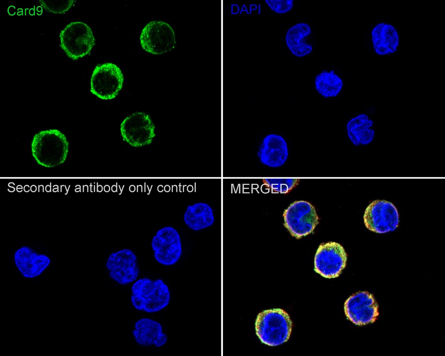 Cells were fixed in 4% paraformaldehyde for 15 minutes at room temperature, permeabilized with 0.1% Triton X-100 in PBS for 15 minutes at room temperature, then blocked with 1% BSA in 10% negative goat serum for 1 hour at room temperature. Cells were then incubated with Rabbit anti-CARD9 antibody (HA750619) at 1/100 dilution in 1% BSA in PBST overnight at 4 ℃. Goat Anti-Rabbit IgG H&L (iFluor™ 488, HA1121) was used as the secondary antibody at 1/1,000 dilution. PBS instead of the primary antibody was used as the secondary antibody only control. Nuclear DNA was labelled in blue with DAPI.