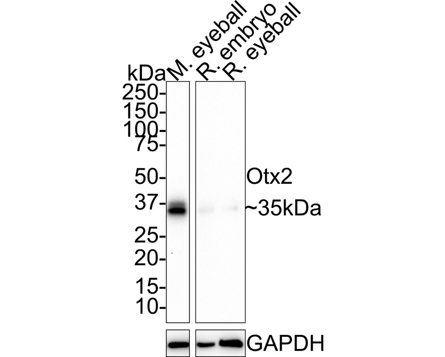 Western blot analysis of Otx2 on different lysates with Rabbit anti-Otx2 antibody (HA750737) at 1/1,000 dilution.