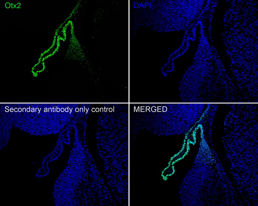 Cells were fixed in 4% paraformaldehyde for 20 minutes at room temperature, permeabilized with 0.1% Triton X-100 in PBS for 5 minutes at room temperature, then blocked with 1% BSA in 10% negative goat serum for 1 hour at room temperature. Cells were then incubated with Rabbit anti-Otx2 antibody (HA750737) at 1/10,000 dilution in 1% BSA in PBST overnight at 4 ℃. Goat Anti-Rabbit IgG H&L (iFluor™ 488, HA1121) was used as the secondary antibody at 1/1,000 dilution. PBS instead of the primary antibody was used as the secondary antibody only control. Nuclear DNA was labelled in blue with DAPI.