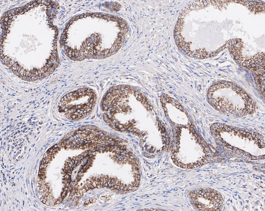 Immunohistochemical analysis of paraffin-embedded human prostate tissue with Rabbit anti-TXNRD2 antibody (HA750794) at 1/1,000 dilution.
