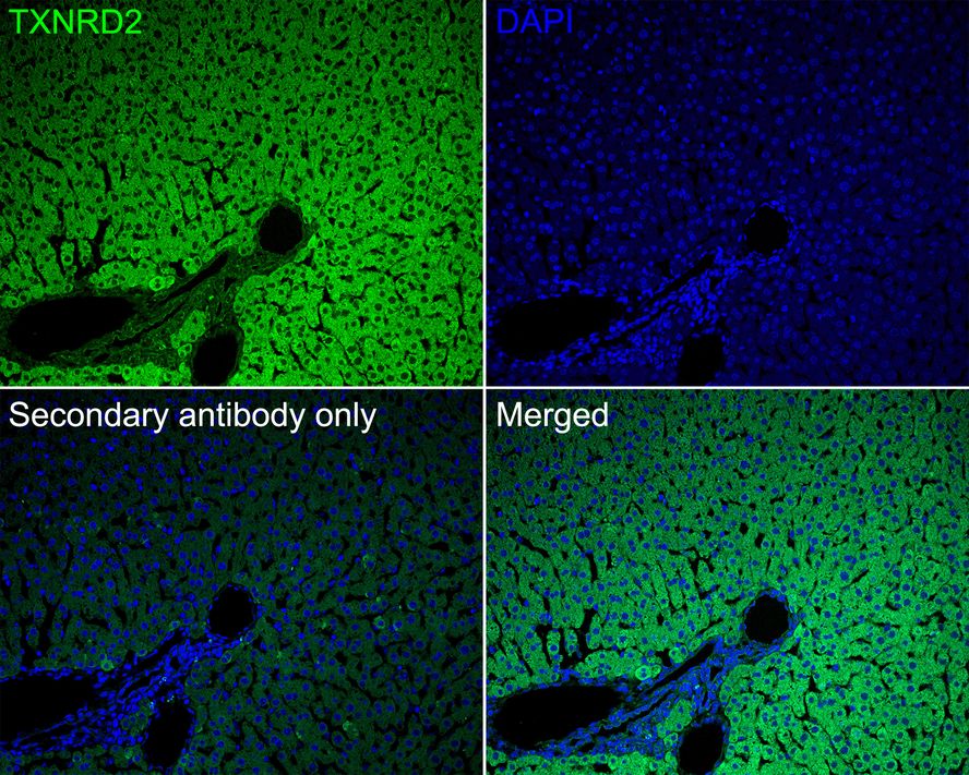 Immunofluorescence analysis of paraffin-embedded rat liver tissue labeling TXNRD2 with Rabbit anti-TXNRD2 antibody (HA750794) at 1/50 dilution.