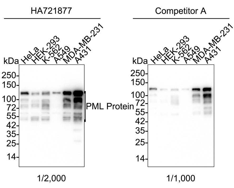 Western blot analysis of PML Protein on different lysates with Rabbit anti-PML Protein antibody (HA750843) at 1/2,000 dilution and competitor's antibody at 1/1,000 dilution.