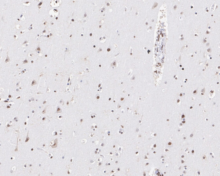 Immunohistochemical analysis of paraffin-embedded human brain tissue with Rabbit anti-PML Protein antibody (HA750843) at 1/1,000 dilution.