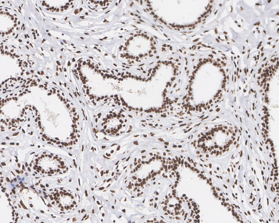 Immunohistochemical analysis of paraffin-embedded human breast tissue with Rabbit anti-PML Protein antibody (HA750843) at 1/1,000 dilution.