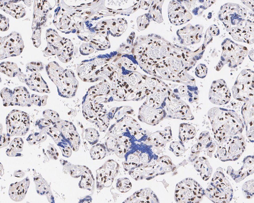 Immunohistochemical analysis of paraffin-embedded human placenta tissue with Rabbit anti-PML Protein antibody (HA750843) at 1/1,000 dilution.