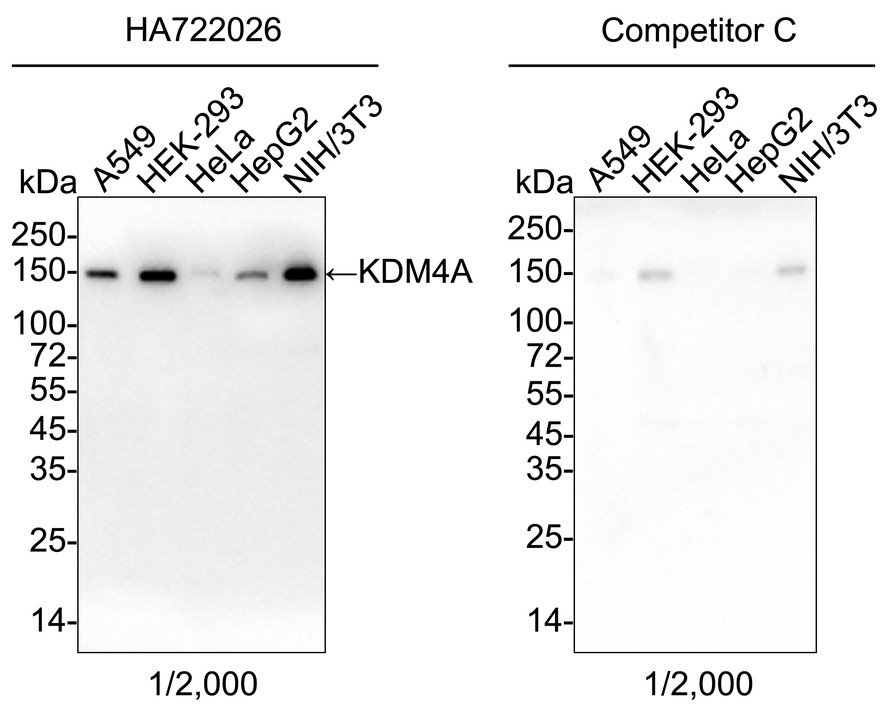Western blot analysis of KDM4A on different lysates with Rabbit anti-KDM4A antibody (HA750901) at 1/2,000 dilution and competitor's antibody at 1/2,000 dilution.