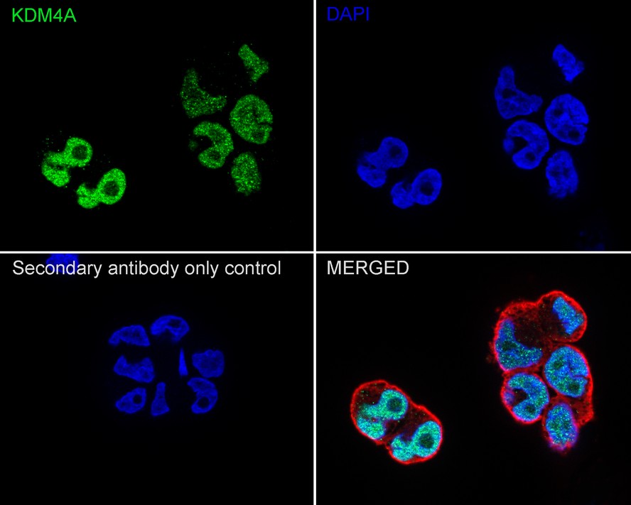 Cells were fixed in 4% paraformaldehyde for 20 minutes at room temperature, permeabilized with 0.1% Triton X-100 in PBS for 5 minutes at room temperature, then blocked with 1% BSA in 10% negative goat serum for 1 hour at room temperature. Cells were then incubated with Rabbit anti-KDM4A antibody (HA750901) at 1/100 dilution in 1% BSA in PBST overnight at 4 ℃. Goat Anti-Rabbit IgG H&L (iFluor™ 488, HA1121) was used as the secondary antibody at 1/1,000 dilution. PBS instead of the primary antibody was used as the secondary antibody only control. Nuclear DNA was labelled in blue with DAPI.