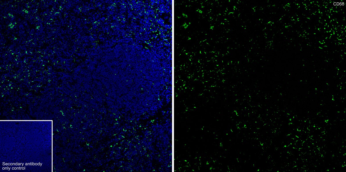 Immunofluorescence analysis of frozen mouse spleen tissue with Rabbit anti-CD68 antibody (HA751006) at 1/500 dilution.