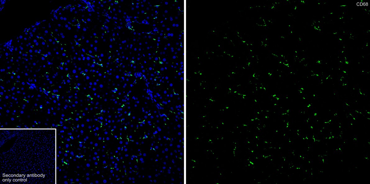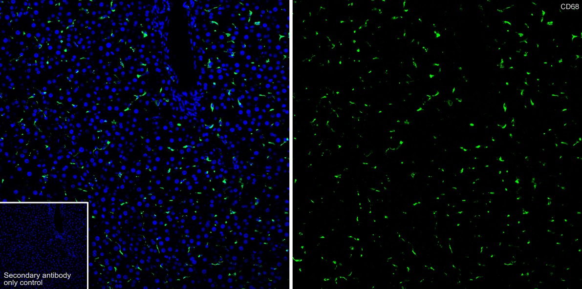 Immunofluorescence analysis of frozen mouse liver tissue with Rabbit anti-CD68 antibody (HA751006) at 1/500 dilution.