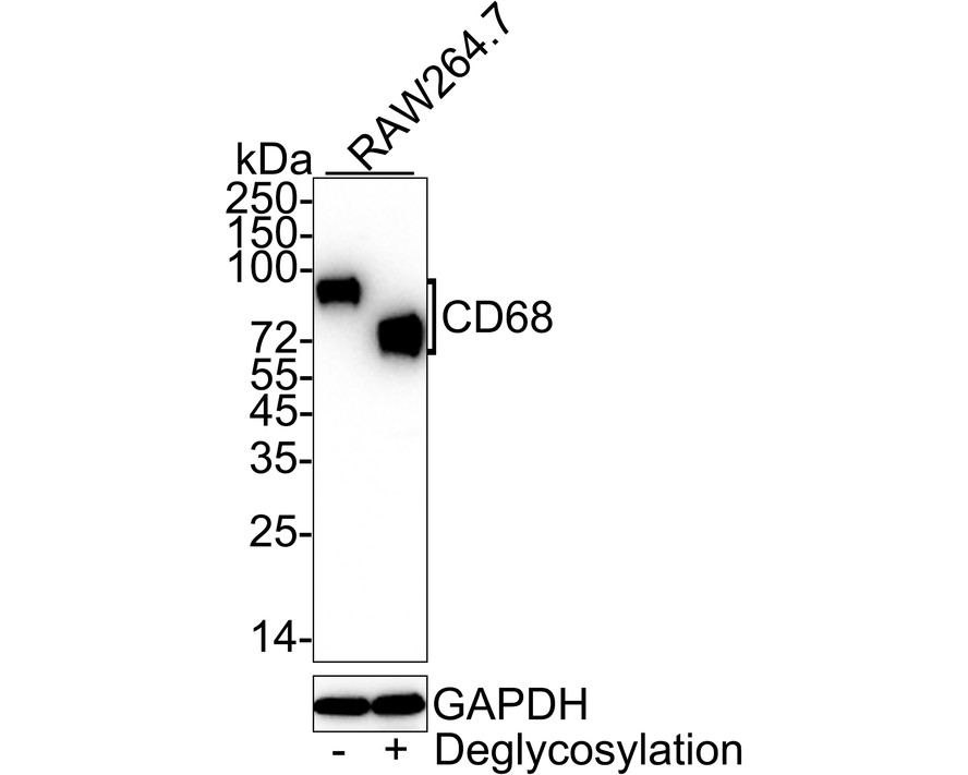 Lane 2: RAW264.7 cell lysate treated with deglycosylation