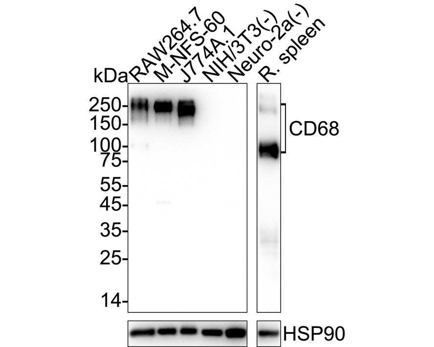Western blot analysis of CD68 on different lysates with Rabbit anti-CD68 antibody (HA751006) at 1/1,000 dilution.
