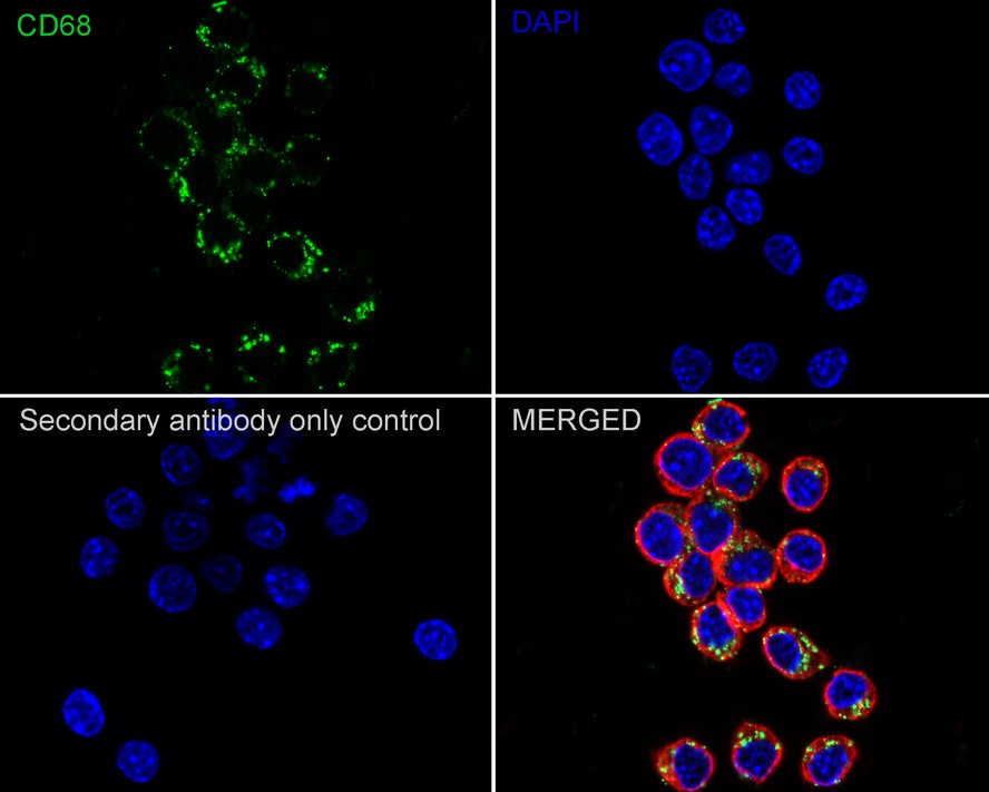 Cells were fixed in 4% paraformaldehyde for 20 minutes at room temperature, permeabilized with 0.1% Triton X-100 in PBS for 5 minutes at room temperature, then blocked with 1% BSA in 10% negative goat serum for 1 hour at room temperature. Cells were then incubated with Rabbit anti-CD68 antibody (HA751006) at 1/100 dilution in 1% BSA in PBST overnight at 4 ℃. Goat Anti-Rabbit IgG H&L (iFluor™ 488, HA1121) was used as the secondary antibody at 1/1,000 dilution. PBS instead of the primary antibody was used as the secondary antibody only control. Nuclear DNA was labelled in blue with DAPI.