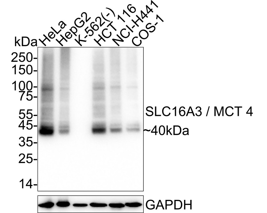 Western blot analysis of SLC16A3 / MCT 4 on different lysates with Rabbit anti-SLC16A3 / MCT 4 antibody (HA751115) at 1/20,000 dilution.