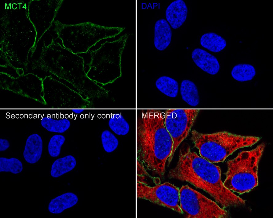 Cells were fixed in 4% paraformaldehyde for 20 minutes at room temperature, permeabilized with 0.1% Triton X-100 in PBS for 5 minutes at room temperature, then blocked with 1% BSA in 10% negative goat serum for 1 hour at room temperature. Cells were then incubated with Rabbit anti-SLC16A3 / MCT 4 antibody (HA751115) at 1/100 dilution in 1% BSA in PBST overnight at 4 ℃. Goat Anti-Rabbit IgG H&L (iFluor™ 488, HA1121) was used as the secondary antibody at 1/1,000 dilution. PBS instead of the primary antibody was used as the secondary antibody only control. Nuclear DNA was labelled in blue with DAPI.