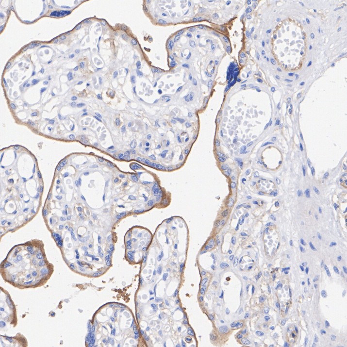 Immunohistochemical analysis of paraffin-embedded human placenta tissue with Rabbit anti-SLC16A3 / MCT 4 antibody (HA751115) at 1/1,000 dilution.