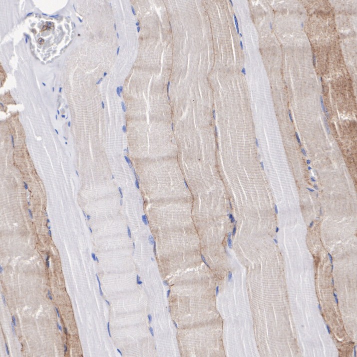 Immunohistochemical analysis of paraffin-embedded human skeletal muscle tissue with Rabbit anti-SLC16A3 / MCT 4 antibody (HA751115) at 1/1,000 dilution.