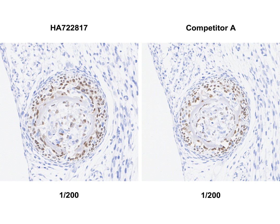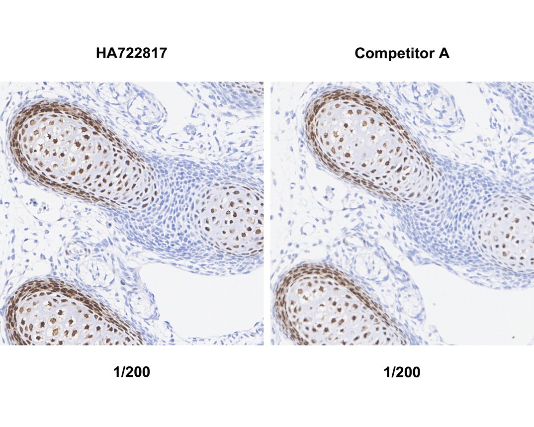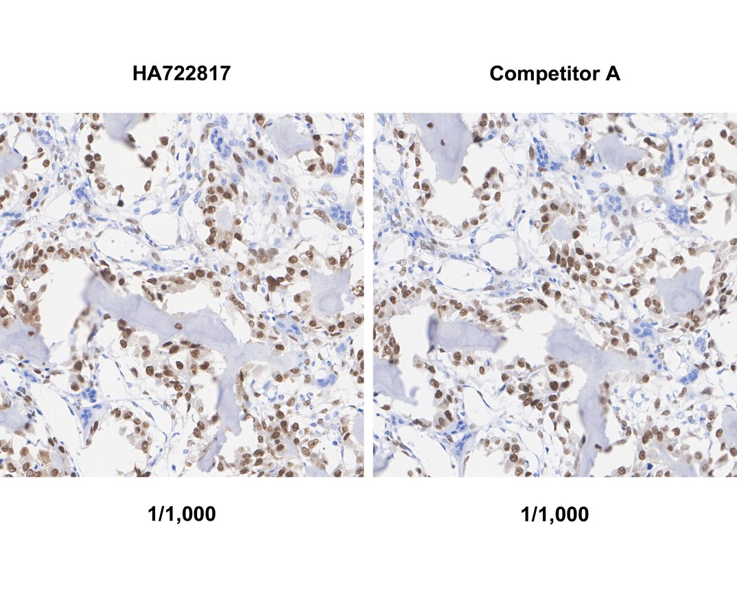 The section was pre-treated using heat mediated antigen retrieval with sodium citrate buffer (pH 6.0) (high pressure) for 2 minutes. The tissues were blocked in 1% BSA for 20 minutes at room temperature, washed with ddH2O and PBS, and then probed with the primary antibody (HA751150) at 1/200 dilution and competitor's antibody at 1/200 dilution for 1 hour at room temperature. The detection was performed using an HRP conjugated compact polymer system. DAB was used as the chromogen. Tissues were counterstained with hematoxylin and mounted with DPX.