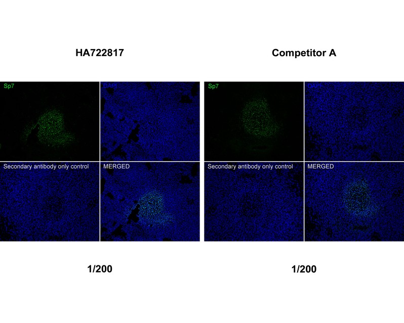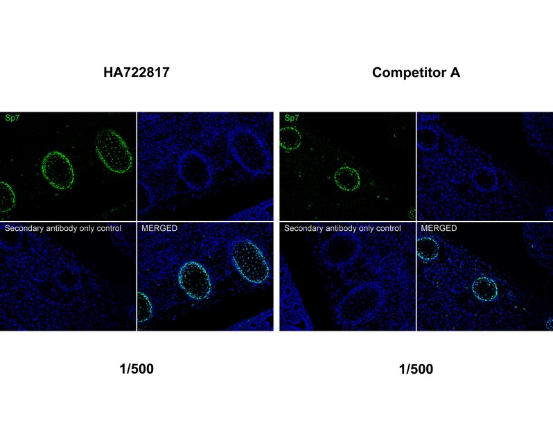 Immunofluorescence analysis of frozen E14.5 mouse embryo tissue with Rabbit anti-Sp7 / Osterix antibody (HA751150) at 1/200 dilution and competitor's antibody at 1/200 dilution.