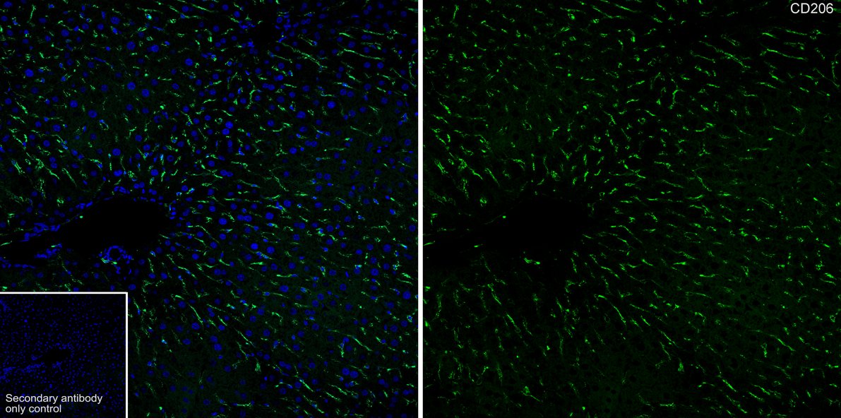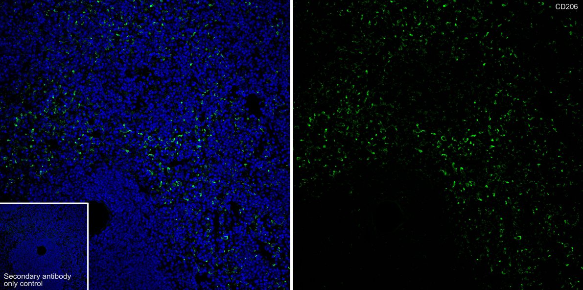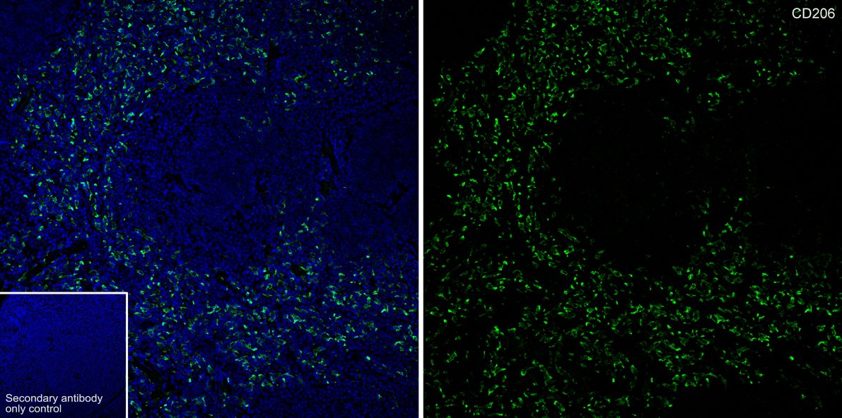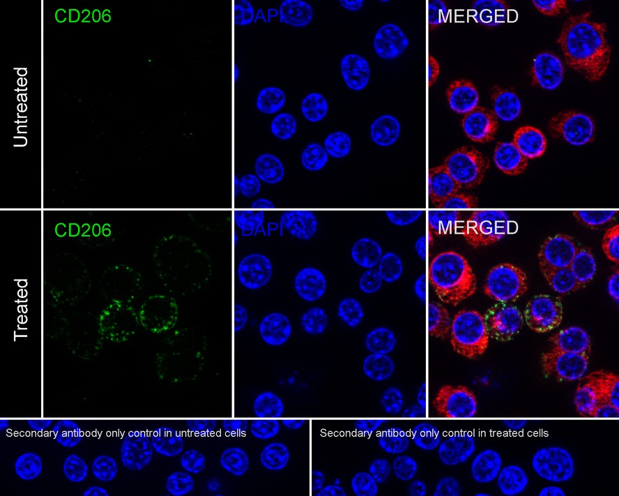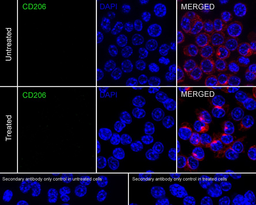 Cells were fixed in 4% paraformaldehyde for 15 minutes at room temperature, permeabilized with 0.1% Triton X-100 in PBS for 15 minutes at room temperature, then blocked with 1% BSA in 10% negative goat serum for 1 hour at room temperature. Cells were then incubated with Rabbit anti-Mannose Receptor(CD206) antibody (HA751188) at 1/50 dilution in 1% BSA in PBST overnight at 4 ℃. Goat Anti-Rabbit IgG H&L (iFluor™ 488, HA1121) was used as the secondary antibody at 1/1,000 dilution. PBS instead of the primary antibody was used as the secondary antibody only control. Nuclear DNA was labelled in blue with DAPI.