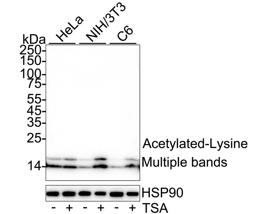 Western blot analysis of Acetylated-Lysine on different lysates with Rabbit anti-Acetylated-Lysine antibody (HA751269) at 1/2,000 dilution.
