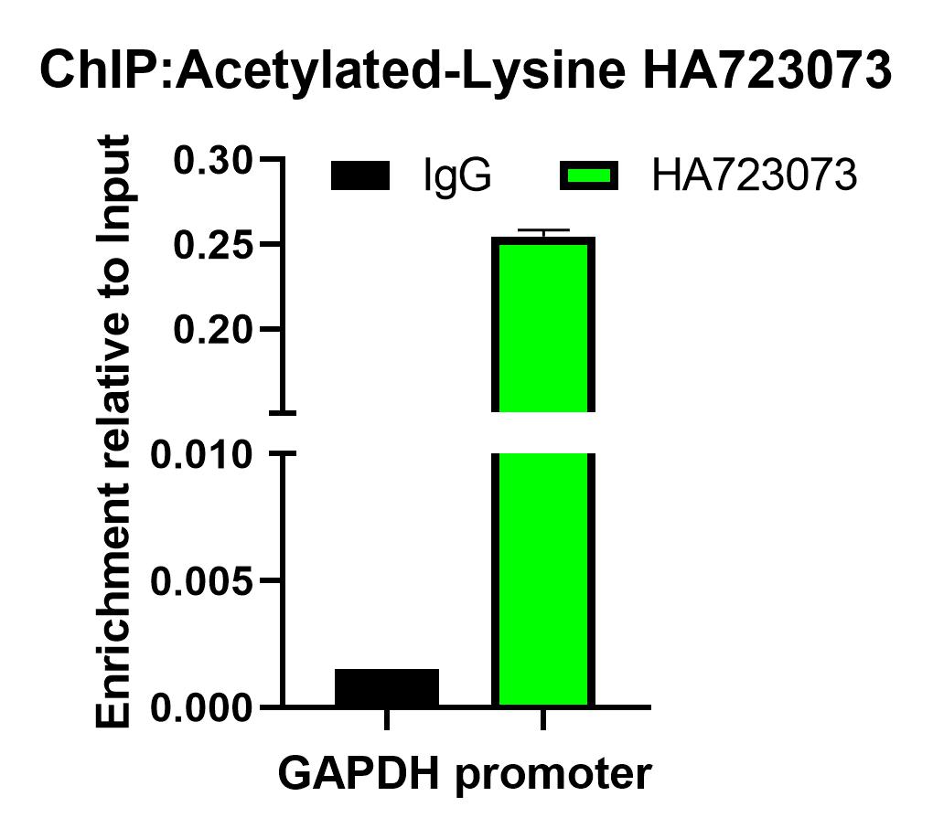 Chromatin immunoprecipitations were performed with cross-linked chromatin from HeLa cells with Acetylated-Lysine (HA751269) or Normal Rabbit IgG according to the ChIP protocol. The enriched DNA was quantified by real-time PCR using indicated primers. The amount of immunoprecipitated DNA in each sample is represented as signal relative to the total amount of input chromatin, which is equivalent to one.