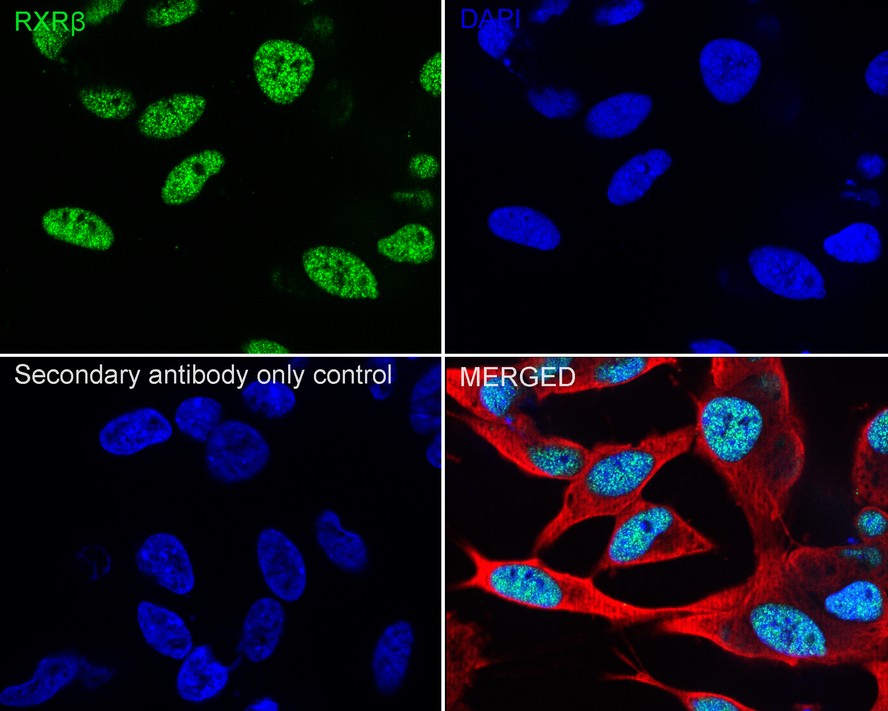 Cells were fixed in 4% paraformaldehyde for 15 minutes at room temperature, permeabilized with 0.1% Triton X-100 in PBS for 15 minutes at room temperature, then blocked with 1% BSA in 10% negative goat serum for 1 hour at room temperature. Cells were then incubated with Rabbit anti-Retinoid X Receptor beta / RXRB antibody (HA751472) at 1/100 dilution in 1% BSA in PBST overnight at 4 ℃. Goat Anti-Rabbit IgG H&L (iFluor™ 488, HA1121) was used as the secondary antibody at 1/1,000 dilution. PBS instead of the primary antibody was used as the secondary antibody only control. Nuclear DNA was labelled in blue with DAPI.