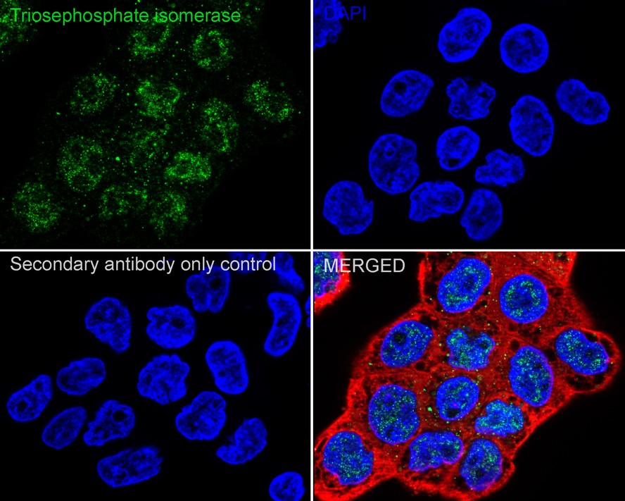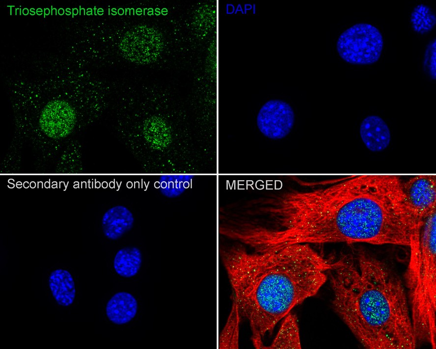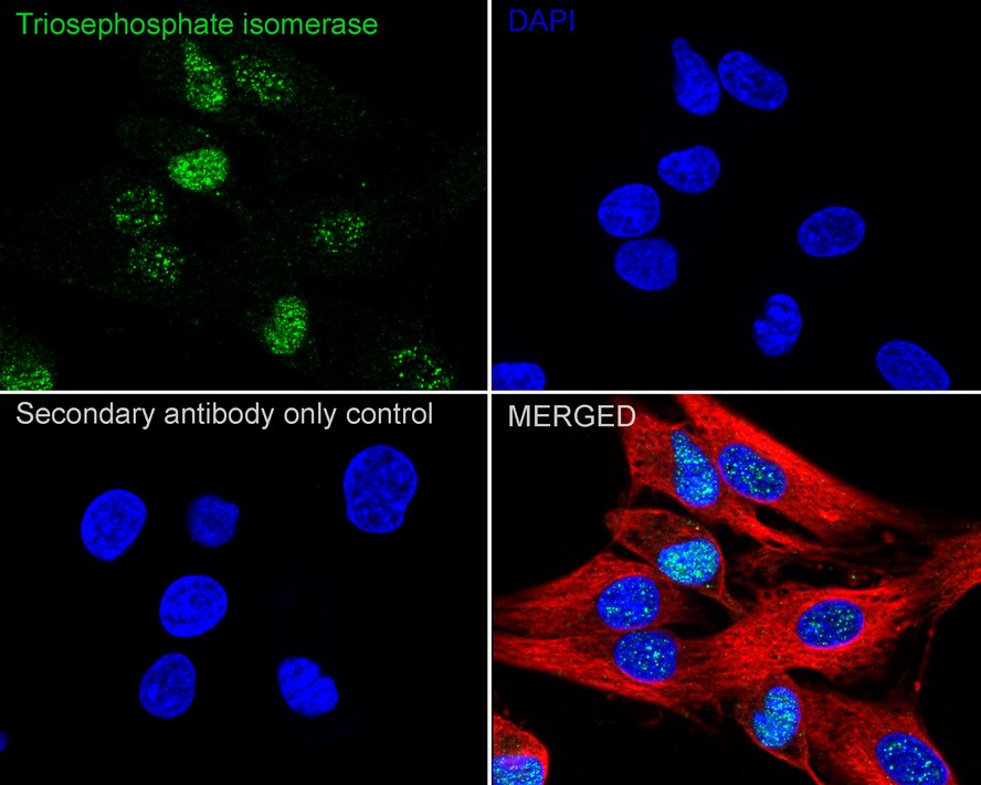 Cells were fixed in 4% paraformaldehyde for 15 minutes at room temperature, permeabilized with 0.1% Triton X-100 in PBS for 15 minutes at room temperature, then blocked with 1% BSA in 10% negative goat serum for 1 hour at room temperature. Cells were then incubated with Rabbit anti-Triosephosphate isomerase antibody (HA751520) at 1/100 dilution in 1% BSA in PBST overnight at 4 ℃. Goat Anti-Rabbit IgG H&L (iFluor™ 488, HA1121) was used as the secondary antibody at 1/1,000 dilution. PBS instead of the primary antibody was used as the secondary antibody only control. Nuclear DNA was labelled in blue with DAPI.