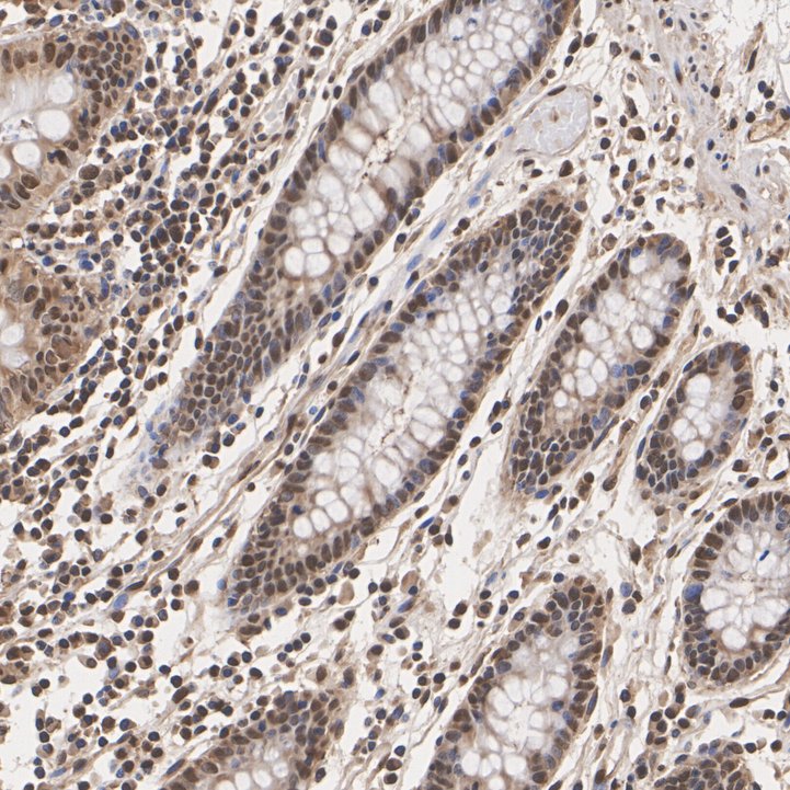 Immunohistochemical analysis of paraffin-embedded human colon tissue with Rabbit anti-Triosephosphate isomerase antibody (HA751520) at 1/1,000 dilution.