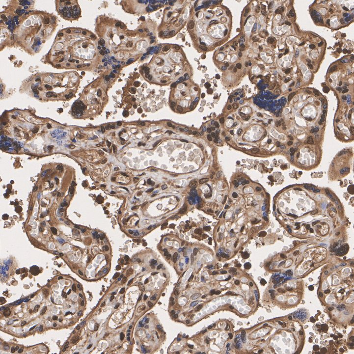 Immunohistochemical analysis of paraffin-embedded human placenta tissue with Rabbit anti-Triosephosphate isomerase antibody (HA751520) at 1/1,000 dilution.