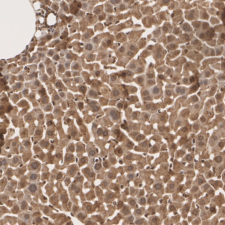 Immunohistochemical analysis of paraffin-embedded rat liver tissue with Rabbit anti-Triosephosphate isomerase antibody (HA751520) at 1/1,000 dilution.