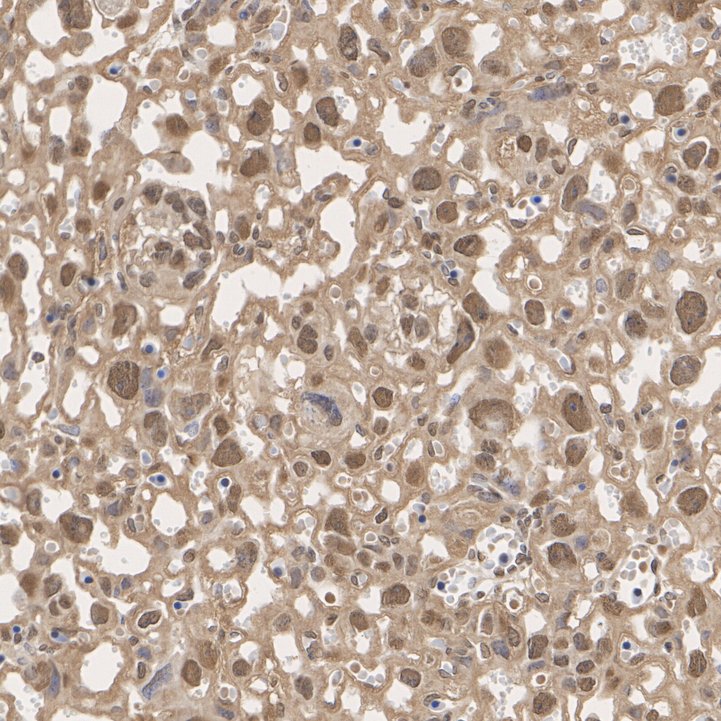 Immunohistochemical analysis of paraffin-embedded rat placenta tissue with Rabbit anti-Triosephosphate isomerase antibody (HA751520) at 1/1,000 dilution.