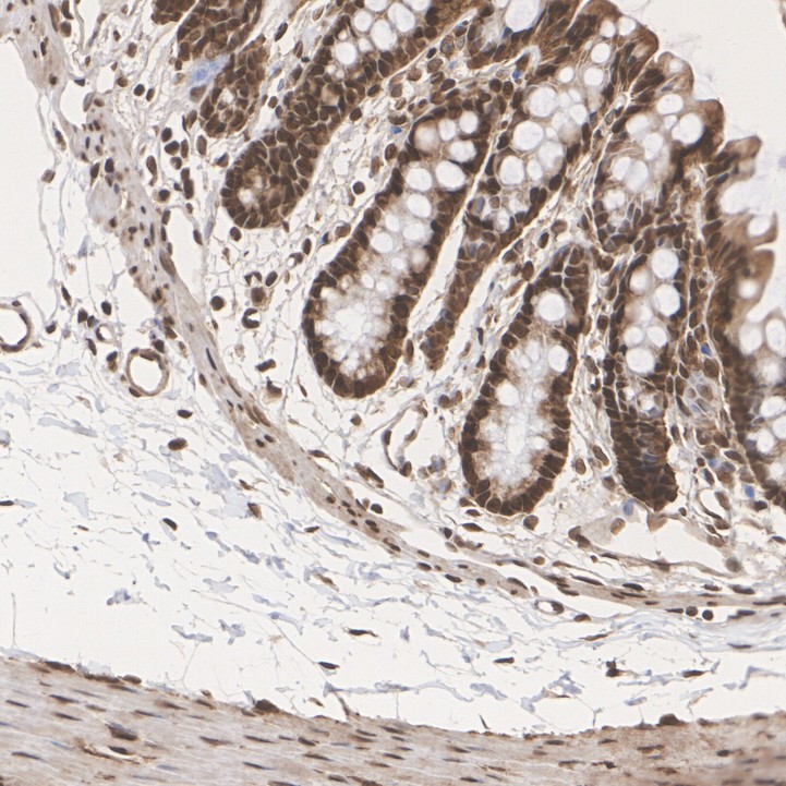 Immunohistochemical analysis of paraffin-embedded mouse colon tissue with Rabbit anti-Triosephosphate isomerase antibody (HA751520) at 1/1,000 dilution.